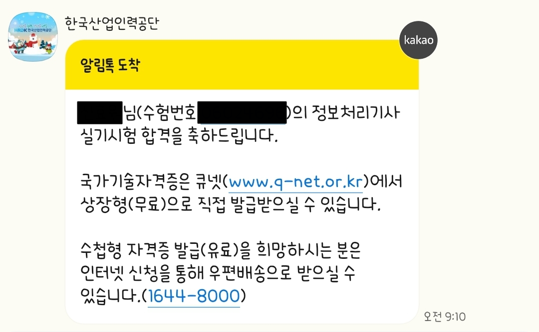 - 실기 시험 발표날 오전 9시가 지나고 약간의 시간 뒤에 이렇게 합격 문자가 온다!