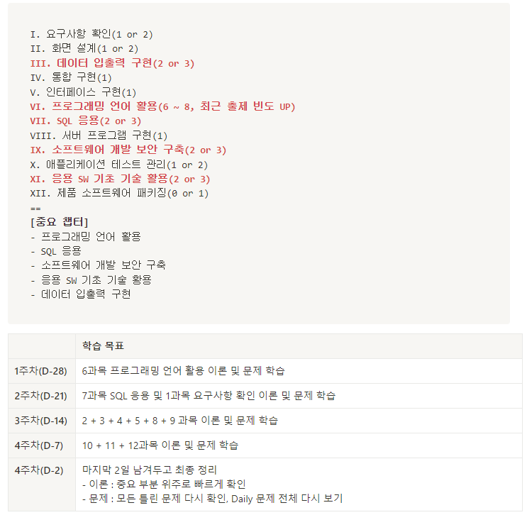 - 효율적인 시간 투자를 위해서는 프로그래밍 → SQL → 소프트웨어 개발 보안 → 응용 SW → 데이터 입출력 순서대로 공부하는 것을 강력 추천하며, 넉넉하게 4주전부터 계획을 세워서 공부하면 좋음!!